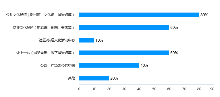 □ 公共文化場館(圖書館、文化館、博物館等) □ 商業文化場所(電影院、劇院、書店等) □ 社區/街道文化活動中心 □ 線上平臺(網絡直播、數字博物館等) □ 公園、廣場等公共空間 □ 其他